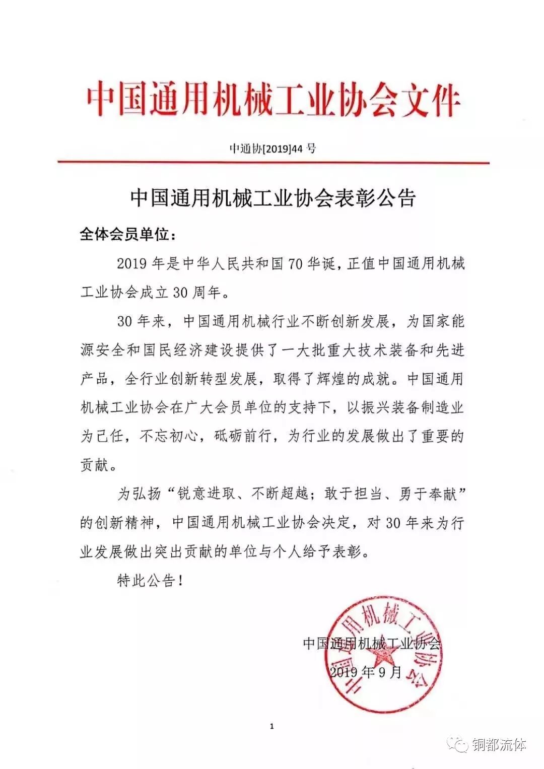 9月13日,中國通用機械工業(yè)協(xié)會發(fā)布表彰公告,對30年來為行業(yè)發(fā)展做出突出貢獻(xiàn)的單位與個人給予表彰。銅都流體榮獲“特色優(yōu)勢企業(yè)”。